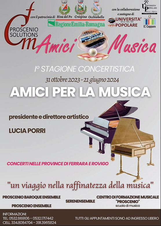Si apre il 31 ottobre 2023 a Riva Del Po la I Stagione Concertistica dell’Associazione Amici perLa Musica APS – Centro di Formazione Artistica e Musicale Proscenio (Scuola di Musica) che inaugura così il suo 5° anno di attività.