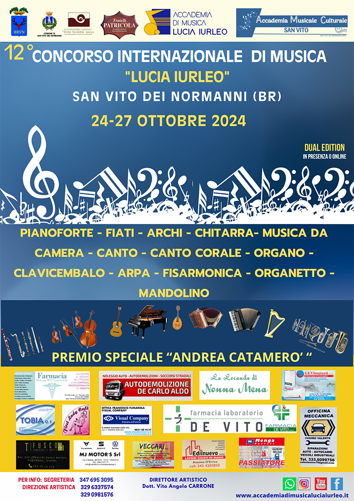 Il 12° Concorso Internazionale di Musica “Lucia Iurleo”, organizzato dall’Accademia Musicale Culturale “San Vito” a.p.s., di San Vito dei Normanni con il Patrocinio della Provincia di Brindisi, della Città di San Vito dei Normanni e del Conservatorio di Musica “Tito Schipa” di Lecce, è aperto a musicisti provenienti da tutto il mondo e si propone di promuovere la diffusione della cultura musicale, di valorizzare il quotidiano impegno di allievi e docenti e di creare, al contempo, occasioni di crescita musicale, culturale e sociale.