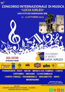 L’Accademia Musicale Culturale “San Vito” di San Vito dei Normanni organizza, dal 12 al 14 ottobre 2023 con il patrocinio della Regione Puglia, della Provincia di Brindisi, della Città di San Vito dei Normanni, A M S (Associazione Musicale Synphonos) e CS Uniforma – Polo Interuniversitario, l’11° edizione del Concorso Internazionale di Musica “Lucia Iurleo”.