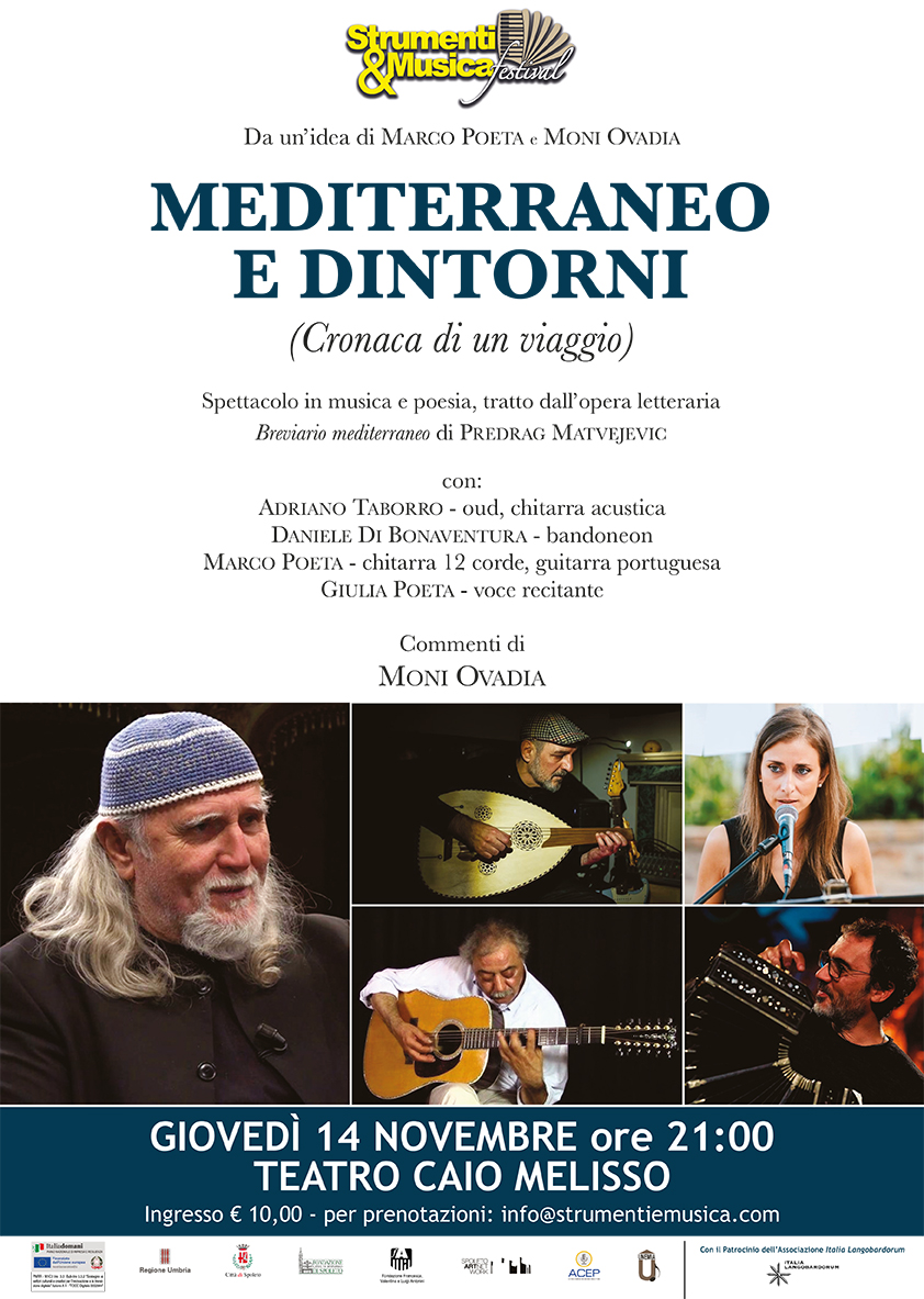 La serata di giovedì 14 sarà caratterizzata dalla presenza di Moni Ovadia, che, al Teatro Caio Melisso, presenterà Mediterraneo e dintorni – Cronaca di un viaggio, uno spettacolo in musica e poesia ideato da lui stesso e da Marco Poeta, tratto dall’opera letteraria Breviario mediterraneo di Predrag Matvejevic (ingresso € 10, prenotazione obbligatoria). Sul palco, assieme al celebre attore e autore, un quartetto d’eccezione: Adriano Taborro (oud, chitarra acustica), Daniele Di Bonaventura (bandoneón), Marco Poeta (chitarra 12 corde, guitarra portuguesa) e Giulia Poeta (voce recitante).