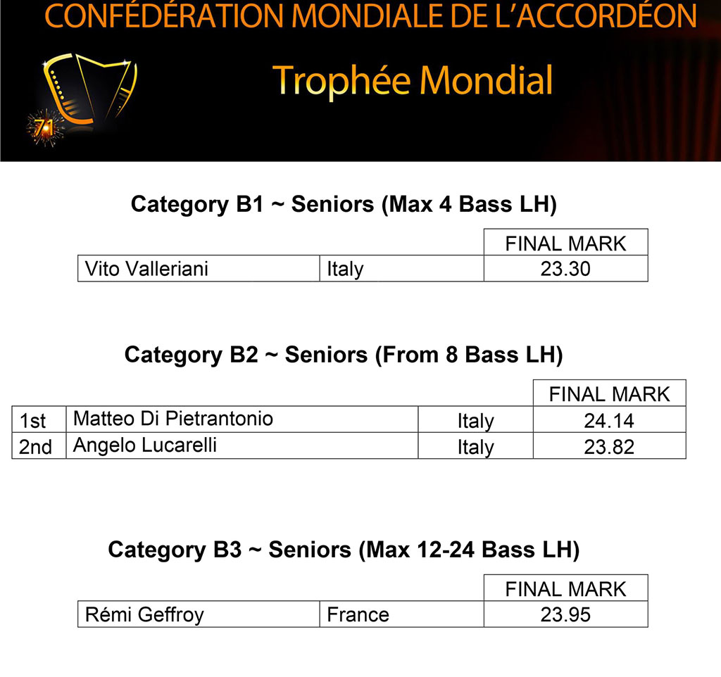 Un anno decisamente positivo (nel senso buono del termine…) il 2021 per i musicisti italiani e, nello specifico, per la scuola teramana del M° Danilo Di Paolonicola che, dopo aver festeggiato la vittoria di Matteo Tortora nelle categorie Junior Variéte e Junior Diatonic del Trophée Mondial de l’Accordéon, si è vista aggiudicare un ulteriore prestigiosissimo riconoscimento con Matteo Di Pietrantonio nella categoria B2 Seniors della medesima competizione.