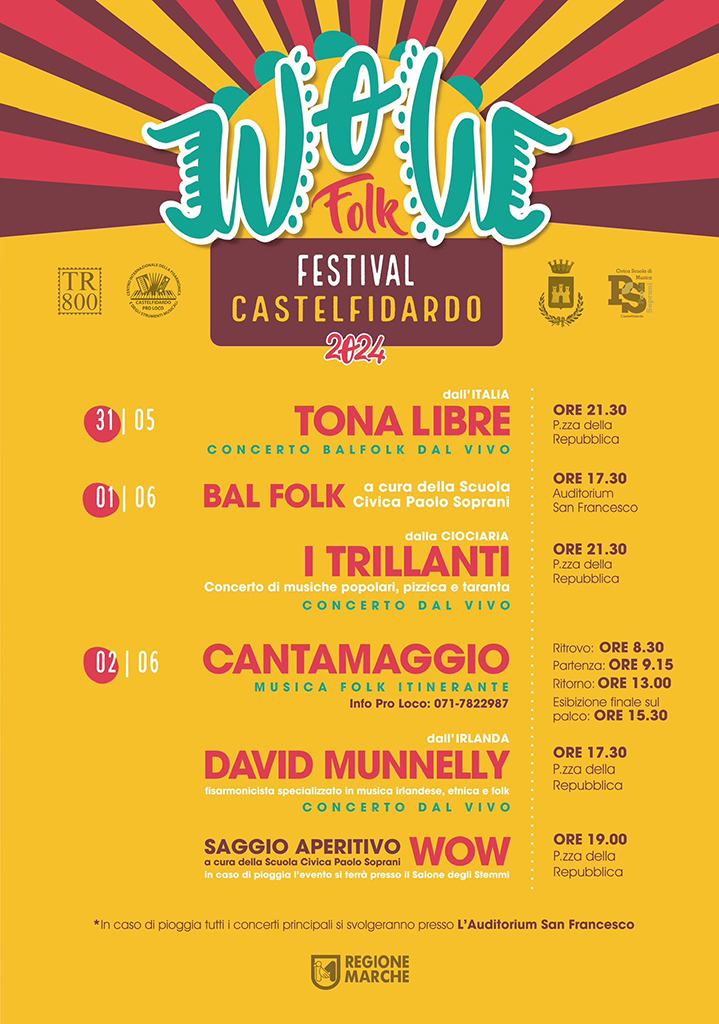 L’anteprima offerta dall’Onach – Orchestra nazionale di fisarmonicisti del Cile – introduce nel clima del Wow Folk Festival che da venerdì 31 a domenica 2 giugno riempirà la piazza fidardense di musica e contaminazioni. Giunto alla settima edizione su iniziativa dell’assessorato alla cultura che ne ha intercettato il valore aggregativo e culturale abbinato alla dimensione artistica, l’evento si articola infatti su tre giornate. «Il filo conduttore rimane il balfolk: le vibrazioni dell’organetto ci accompagnano in un percorso coinvolgente che include momenti di formazione con un maestro di fama internazionale e serate di condivisione che allietano e colorano il centro storico, sfociando nell’ormai tipico Cantamaggio castellano», spiega l’assessore Ruben Cittadini, sottolineando come la tradizione si leghi ad aspetti innovativi.