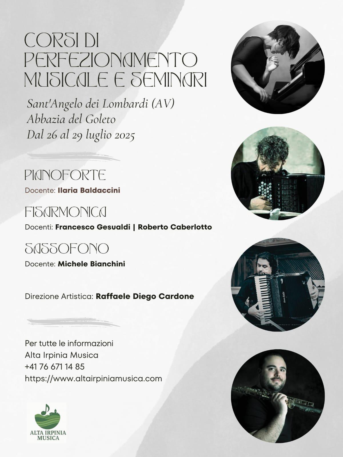 Nati da un’idea del fisarmonicista Raffaele Diego Cardone nel 2024, i corsi di perfezionamento musicale estivi a Sant’Angelo dei Lombardi (AV) “Note tra le Mura dell’Abbazia del Goleto”, giungono alla loro seconda edizione. Le lezioni sono tenute da musicisti con carriere concertistiche internazionali e docenti di Conservatorio, nonché membri del GAMO Ensemble di Firenze, ensemble in residenza del GAMO-Gruppo Aperto Musica Oggi, una delle più antiche e illustri istituzioni italiane dedicate alla musica contemporanea.
