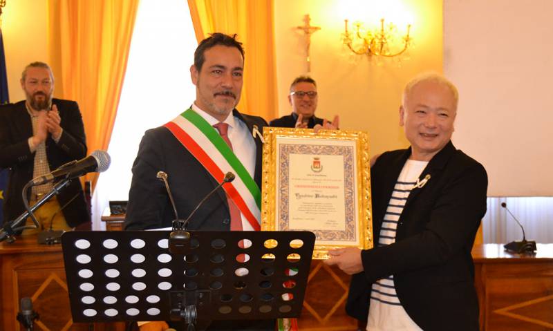 CASTELFIDARDO – «L’Italia mi ha cambiato la vita e mi ha dato tutto, specialmente Castelfidardo, la patria della fisarmonica dove ho costruito la mia cultura musicale». Una notorietà internazionale, una carriera lunga 40 anni impreziosita da 37 album, due milioni di dischi venduti, centinaia di concerti in oltre 60 Paesi, migliaia di composizioni, riconoscimenti e collaborazioni ai più alti livelli: eppure, Yasuhiro Kobayashi, in arte Coba, la star acclamata da schiere di fan e dalla rete asiatica Nhk che lo ha seguito anche in questa trasferta, non ha trattenuto la commozione. E con gli occhi lucidi ha ricevuto la cittadinanza onoraria conferitagli dal Consiglio Comunale per gli elevati meriti artistici, per avere radicalmente trasformato l’immagine della fisarmonica inserendola con successo nella musica pop contemporanea. “Celebriamo non un musicista ma un modello da prendere ad esempio, un grande che ci onora della sua presenza con la semplicità e l’affetto di un amico”, ha sottolineato il sindaco Roberto Ascani sottolineando l’umiltà di Coba che non ha esitato a raccontare se stesso. Svelando la sua delusione quando a 8 anni, già iniziato al pianoforte, il padre gli donò una fisarmonica: per oltre sei mesi quello strumento indesiderato rimase chiuso nella custodia, ma quando la curiosità ebbe il sopravvento e lo aprì per sentirne il suono la passione è sbocciata dirompente. «A differenza del piano che tocchi solo con le dita della mano, la fisarmonica la abbracci, diventa un tutt’uno ed è come se le vibrazioni uscissero dal petto: da quel momento ho deciso che volevo inventarne un nuovo stile, riscattandola dai vecchi canoni e valorizzandola sulla scena pop: la centralità doveva averla la voce della fisarmonica, non quella del cantante».