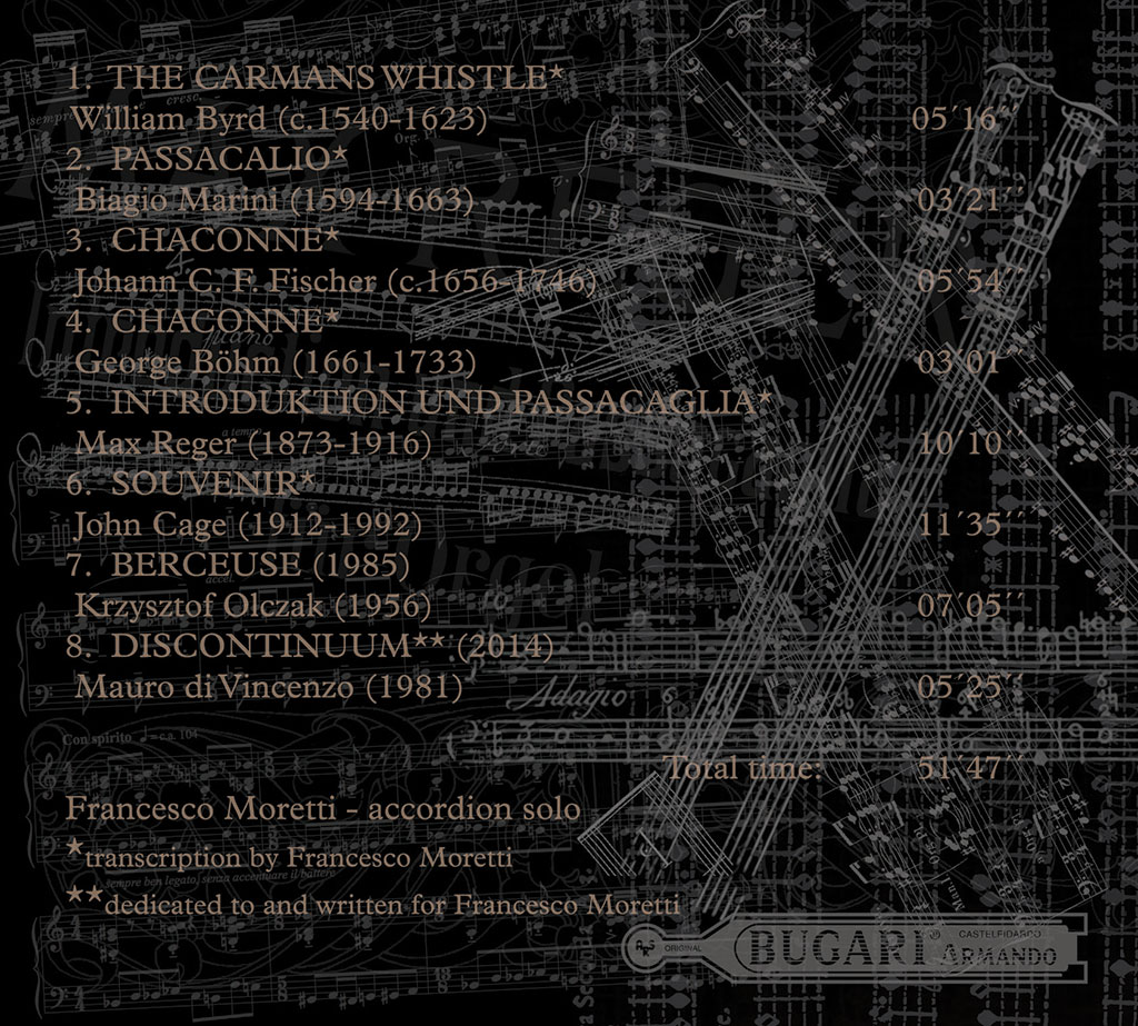 La Chaconne in F di Fischer è una musica a me molto cara ed è stato per me un grande onore sapere di aver ispirato Francesco Moretti a farne uno dei brani principali del suo repertorio. Infatti, la sua trascrizione rivela tutto il piacere che lui stesso prova nell’ascoltarla, nell’eseguirla e nell’arricchirla con la completa varietà di timbri del suo strumento. Nella seconda parte del disco, i brani si susseguono, infatti, in ordine cronologico: si trovano due musiche del ventesimo secolo e un brano che, al momento della registrazione, non era ancora edito, scritto appositamente per esser integrato nell’album. Il primo è ancora una trascrizione dall’organo, Souvenir di John Cage. Musica che Francesco Moretti mi ha raccontato di averlo molto affascinato al primo ascolto durante un concerto d’organo presso la Blå Hallen di Stoccolma e dalla semplicità sbalorditiva quanto mistica, per la diluizione dei minimi elementi che la compongono in un fluire di tempo dilatato ed impercettibile. Infatti, il fisarmonicista stava già approfondendo da un anno, per la tesi di laurea a Stoccolma, gli scritti di Cage e investigandone l’attitudine alla vita e all’arte, grazie alla profonda consapevolezza della quale ne conduce un’interpretazione senza tempo, dalle sensazioni orientali, che mi ricorda la sua interpretazione di Melodia, musica originale per fisarmonica del compositore giapponese Toshio Hosokawa. L’unico brano nel disco tratto dal repertorio fisarmonicistico è la Berceuse del compositore polacco Krzysztof Olczak, la cui musica invidio e che Francesco Moretti, in contrappunto agli altri brani da lui trascritti dall’organo, mi fa desiderare di avere nel repertorio organistico. La Berceuse culla l’ascolto verso altri paesaggi quasi immobili, nasce e si dissolve da suoni quasi impercettibili e vive di sogni liquidi che si dilatano e sgonfiano come bolle di sapone. Il sofisticato e affascinante Discontinuum, ultimo brano, mostra giovani ritmicità e dimostra la passione del fisarmonicista per la scoperta dell’arte che vive intorno a lui, per la musica creata non solo nel suo tempo, ma nei suoi giorni, dalle sue conoscenze e relazioni personali. Ho saputo, infatti, che la stesura del brano ha necessitato di lunghi momenti di discussione tra compositore ed esecutore e, quindi, molte rivisitazioni e ricostruzioni. Questa critica collaborazione, felice per l’umano intelletto, fa onore a Francesco Moretti, che ha saputo circondarsi di persone che stima e da cui viene stimato, per far fiorire nuova letteratura di valore per lo strumento che tanto ama. In conclusione, non posso che augurare a questo artista di avere molteplici occasioni per condividere, come a lui tanto piace, i risultati dei propri studi e delle attente ricerche musicali.