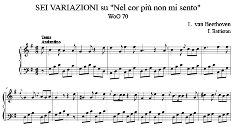 Ludwig van Beethoven, Sei Variazioni su Nel cor più non mi sento WoO 70, trascrizione per fisarmonica da concerto di Ivano Battiston, Ars Spoletium, 2020, pp. 10.