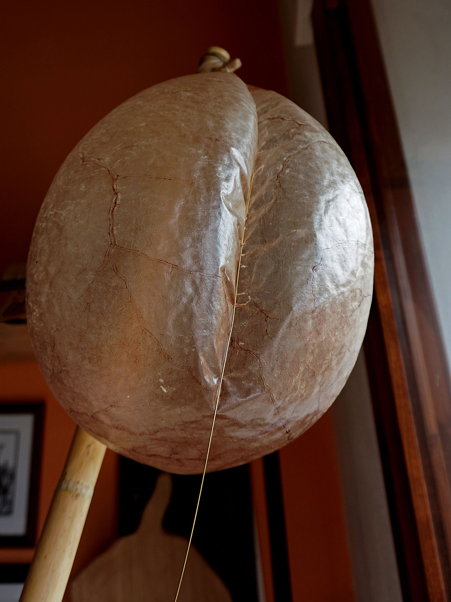 Alle due estremità del bastone vengono praticati i fori in cui si inseriscono i piroli di legno che tendono la corda. Quest’ultima può essere di crine di cavallo intrecciato e ricoperto di pece, di budello ritorto o di filo di rame o di ottone. Durante la costruzione dello strumento, la vescica di maiale viene pulita dalle nervature, essiccata all’ombra e gonfiata come un palloncino.