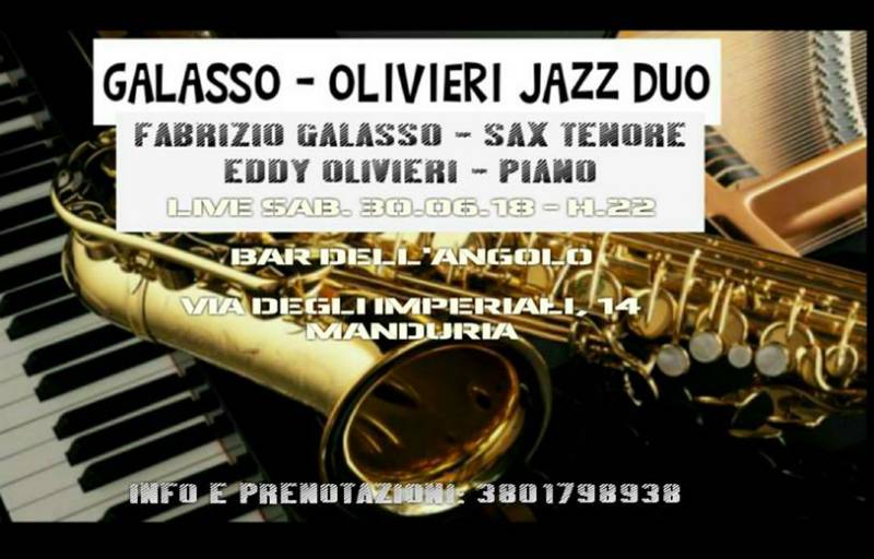 Un duo elegante e affiatato che affonda profondamente le radici nel puro mainstream. Sabato 30 giugno, ore 22:00, al Bar dell’Angolo (Via degli Imperiali, 14 – Manduria) di Carmelo Massafra, Fabrizio Galasso (sax tenore) ed Eddy Olivieri (piano) daranno vita a un live incardinato su alcuni memorabili standard jazz che hanno fortemente segnato un’epoca di questo fascinoso genere musicale, il tutto locupletato da un sopraffino senso dello swing connaturato al DNA di questi due brillanti jazzisti. Sanguigno bopper, sassofonista dal fraseggio fluente, limpido, dal suono caldo e corposo, Galasso è un talento del jazz nostrano. Nel corso della sua attività concertistica ha calcato il palco insieme a svariati musicisti di spicco del panorama jazzistico, fra i quali: Mala Waldron, Phil Maturano, Maurizio Giammarco, Nico Morelli, Luca Alemanno, Paolo Recchia, Daniele Gorgone, Francesco Angiuli, Roberto Ottaviano. Le sue qualità musicali sono state apprezzate anche fuori dai confini nazionali, in Paesi come Germania e Olanda. Olivieri è un pianista enciclopedico, dall’infinita esperienza, dal tocco vellutato e dalla colta musicalità. Nell’arco della sua carriera, trascorsa per molti anni negli Stati Uniti, ha collaborato con diversi giganti del jazz mondiale, come Chet Baker, Lee Konitz, Billy Higgins, Toquinho, Elza Soares, Jim Porto, Steve Grossman, Alfredo Paixao, Frank Wilson, Earl Palmer, solo per citarne alcuni. Galasso-Olivieri Jazz Duo è un binomio sinonimo di energia swingante e raffinatezza comunicativa. Un concerto ideale per tutti i cultori del jazz indissolubilmente legati alla tradizione.