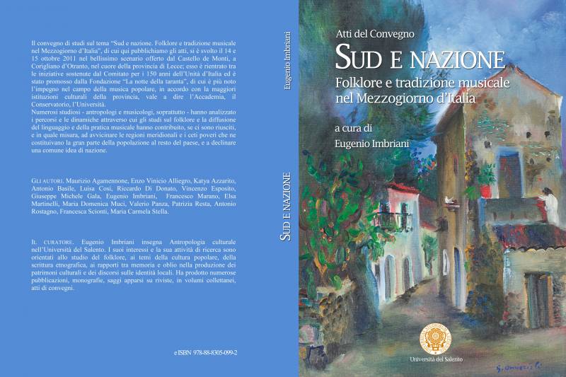 È uscito per le Edizioni Università di Lecce “Sud e nazione. Folklore e tradizione musicale nel Mezzogiorno d’Italia”, a cura dell’antropologo Eugenio Imbriani. Il volume raccoglie gli atti del convegno omonimo, svoltosi a Corigliano d’Otranto, nel Castello de Monti, il 14 e 15 ottobre 2011. Come si può leggere nella quarta di copertina del volume, l’incontro “è rientrato tra le iniziative sostenute dal Comitato per i 150 anni dell’Unità d’Italia ed è stato promosso dalla Fondazione La notte della taranta, di cui è più noto l’impegno nel campo della musica popolare, in accordo con la maggiori istituzioni culturali della provincia, vale a dire l’Accademia, il Conservatorio, l’Università. Numerosi studiosi – antropologi e musicologi, soprattutto – hanno analizzato i percorsi e le dinamiche attraverso cui gli studi sul folklore e la diffusione del linguaggio e della pratica musicale hanno contribuito, se ci sono riusciti, e in quale misura, ad avvicinare le regioni meridionali e i ceti poveri che ne costituivano la gran parte della popolazione al resto del paese, e a declinare una comune idea di nazione”.