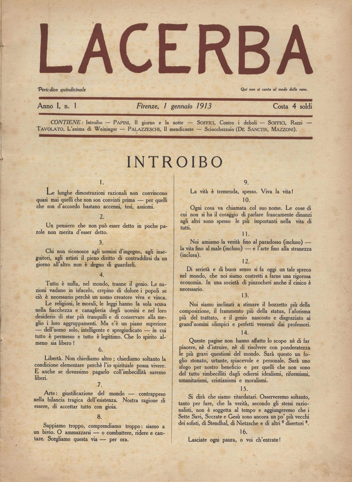 Mentre il pittore-musicista dà alle stampe L’arte dei rumori – quarto manifesto del futurismo musicale – enunciandovi il concetto di suono/rumore, mette in scena al Teatro Storchi di Modena, per la prima volta, un intonarumori, e scrive un testo sull’uso compositivo dell’enarmonìa, Giovanni Papini, scrittore, e Ardengo Soffici, scrittore e pittore, fondano a Firenze “Lacerba”, rivista di letteratura, arte e politica, che alla missione di operare un aggiornamento del gusto poetico e figurativo e accelerare il processo di ammodernamento della letteratura e dell’arte italiane, associa il gusto di spaventare il borghese con atteggiamenti estremi e, a volte, clowneschi, auspicando guerra e rivoluzione e propugnando un acceso nazionalismo con modi e parole decisamente futuristi.