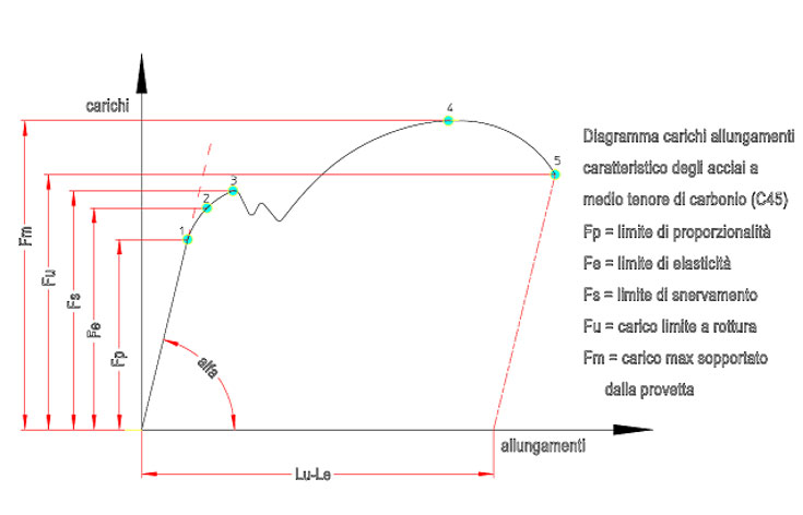 - Fig. 1 – Diagramma sforzo deformazione di un acciaio a medio tenore di carbonio (C45)