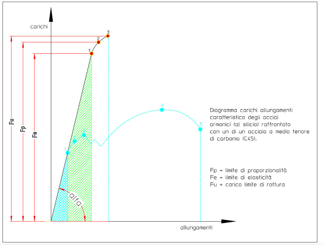 - Fig. 2 – Confronto tra il diagramma sforzo deformazione di un acciaio a medio tenore di carbonio (C45) ed un acciaio al silicio (armonico). Notare sia la differenza tra le due curve, sia i differenti valori del limite di proporzionalità che, nel caso dell’acciaio armonico, risulta essere molto maggiore rispetto a quello del C45.