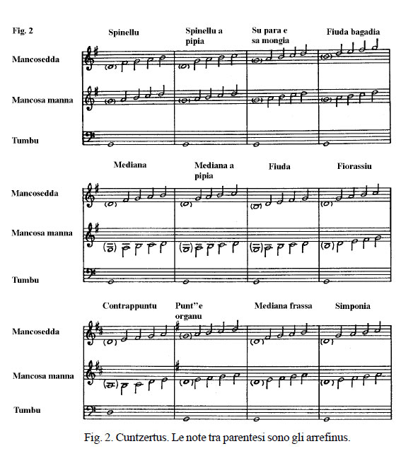 Launeddas non è da intendersi come il nome di un singolo strumento, ma, piuttosto, come un termine generico da utilizzarsi per identificare un’ampia famiglia di strumenti. Come abbiamo appena detto, il singolo strumento è formato dall’insieme delle tre canne mancosedda, mancosa e tumbu imboccate contemporaneamente dal musicista. Le caratteristiche di queste canne, però, non sono standard, poiché possono differenziarsi per lunghezza e/o grossezza, per la posizione dei fori e per il criterio del loro raggruppamento in un unico strumento. Il rapporto tra i suoni di base delle tre canne e tra l’escursione delle note delle due canne melodiche non è costante. Ciò fa sì che, al variare di tale rapporto, si costituiscano differenti cuntzertus, ovvero diversi tipi di strumento. Ogni cuntzertu si differenzia dagli altri per il singolare modello scalare (comunque compreso all’interno della scala maggiore) e per il nome che lo identifica (mediana, fiorassiu, punt’e organu, fiudedda). Essendo gli strumenti unici per tonalità ed escursione melodica, è facilmente intuibile come ad ogni cuntzertu corrispondano dei repertori specifici e non eseguibili con gli altri strumenti. Il cuntzertu di mediana potrà, quindi, eseguire soltanto il proprio specifico repertorio e non quello che si può invece eseguire con il cuntzertu di fiorassiu, punt’e organu, etc. Da questa rigida regola è scaturita la prassi di chiamare il ballo con il nome del cuntzertu che lo eseguiva. Il cuntzertu di punt’e organu esegue, dunque, il ballo punt’e organu, il cuntzertu di fiorassiu esegue il ballo fiorassiu e così via per ogni tipologia di cuntzertu.