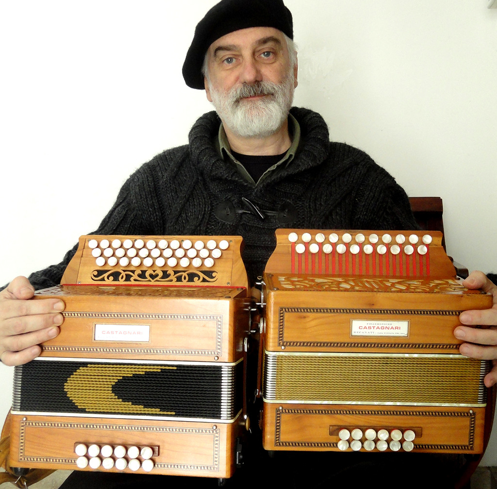 Io mi sono fatto fare dall’azienda Castagnari un organetto in “re-sol-do”, abbastanza inusuale, a tre file, che mi permette anche di suonare su tonalità che i cantanti possono raggiungere, poi ne ho un altro (un vecchio Baffetti) in “fa-si bemolle”. Cerco sempre di avere la possibilità di suonare durante i canti, anche se non è detto che lo faccia o sia necessario.
