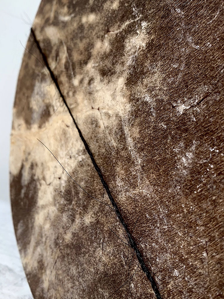 Terminata quest’ultima operazione, una volta risciacquata e fatta asciugare, la pelle è pronta per essere montata sul cilindro. Viene distesa con attenzione, ripiegata ai bordi e assicurata, tramite una correggia, ad un cerchio di filo di ferro (anticamente, intorno ad un fuscello di legno) disposto lungo la circonferenza del cilindro.