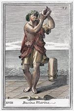 Su corru marinu - Il dio del mare Tritone mentre suona una conchigliaÈ il più grande mollusco gasteropode marino del Mediterraneo, misura mediamente tra i 30/35 centimetri di lunghezza, talvolta raggiunge anche i 40 e si trova lungo le coste rocciose a profondità che variano tra gli 8 e i 50 metri in una vasta area che comprende il Mar Mediterraneo, il Mare del Nord, l’Oceano Atlantico e l’Oceano Indiano.