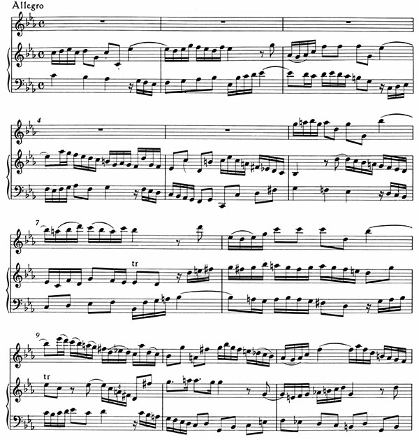 - Per diversi motivi la scrittura, in particolare quella tastieristica, è estremamente essenziale. Mancano i segni di articolazione che siamo abituati a trovare nelle partiture più recenti, spesso vengono sottintesi gli abbellimenti e la diffusione della pratica dell’improvvisazione ci impedisce di sapere precisamente cosa e come si suonasse all’epoca. Si confrontino, a tal proposito, la parte del violino e quella del cembalo obbligato nell’Allegro (2° tempo) della Sonata in Do minore BWV1017 di Johann Sebastian Bach, tratte da un’edizione fedele agli originali: a battuta 9 le semicrome del violino (nel pentagramma superiore) sono dettagliatamente raggruppate mentre lo stesso passaggio per il cembalo (batt.4) non presenta alcun segno di articolazione; similmente le semicrome del violino a battuta 7 presentano legature che non appaiono a battuta 2 nella parte del cembalo